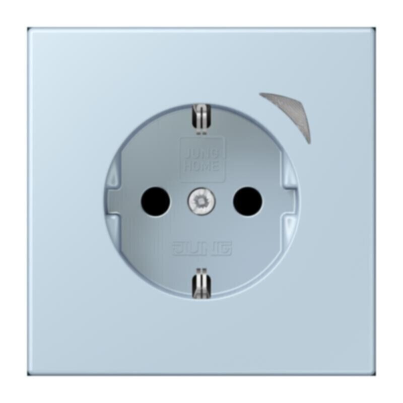 JUNG HOME Schutzkontakt® Steckdose Energy, outremerclair mit integriertem erhöhten Berührungsschutz (Safety Plus) mit Schraubklemmen für starre und flexible Leiter bis 2,5 mm2 Verbindungsklemmen nach DIN VDE 0620 Tragring, Krallen und Krallenschrauben sind über eine Erdungsschiene in die Schutzmaßnahme eingebunden. Bestimmungsgemäßer Gebrauch Manuelles oder automatisches Schalten von Beleuchtung und haushaltsüblichen Geräten Leistungs- (W) und Energiemessung (kWh) der angeschlossenen Geräte Drahtlose Verknüpfung mit Geräten des JUNG HOME Systems Einsatz im trockenen Innenbereich Montage in Gerätedose mit Abmessungen nach DIN 49073 Tiefe der Gerätedose (Innenmaß): min. 53 mm   Produkteigenschaften Inbetriebnahme und Bedienung über JUNG HOME App mit mobilem Endgerät (Smartphone oder Tablet) über Bluetooth® Taste zum Schalten Mehrfarbige Statusanzeige mit optionalem Nachtmodus Sperren der lokalen Bedienung Bis zu 16 Zeitprogramme Einbindung der Last in Bereiche (Gruppen), Zentralfunktionen und Szenen Automatikfunktionen aktivieren/deaktivieren über JUNG HOME App Automatische Datum- und Uhrzeitaktualisierung bei Verbindung mit Smartphone Integrierter Schaltaktor mit 16 A Leistungsmessung von 0,1 bis 3680 Watt und Energiemessung (kWh) Aufzeichnung des Energieverlaufes letzte 24 Stunden und letzte 31 Tage (Charting) Betriebsstundenzähler, Zeitraum der Energiemessung Power-Save-Funktion (Abschalten von Standby-Verbrauchern) Master-Slave-Funktion (abhängig vom angeschlossenen Verbraucher einen drahtlos verknüpften Verbraucher einschalten) Überstrom-Schutzabschaltung Bluetooth® SIG Mesh für voll verschlüsselte drahtlose Kommunikation und Repeaterfunktion Updatefähig über JUNG HOME App Zukünftig per Update verfügbar: (Hinweise zu Updates und Terminen finden sie unter jung.group/junghome) Sperr- und Zwangsführung: Dauer-EIN/AUS oder für feste Zeit EIN/AUS Zeitprogramme mit Sonnenauf- bzw. Sonnenuntergang (Astrotimer) Zeitprogramme mit Zufallszeitpunkt Ein-/ Ausschaltverzögerung Eingespeiste Leistung von -0,1 bis -3680 Watt und eingespeiste Energie (kWh) Material: Thermoplast lackiert Maße (B x H): 70 x 70 mm
