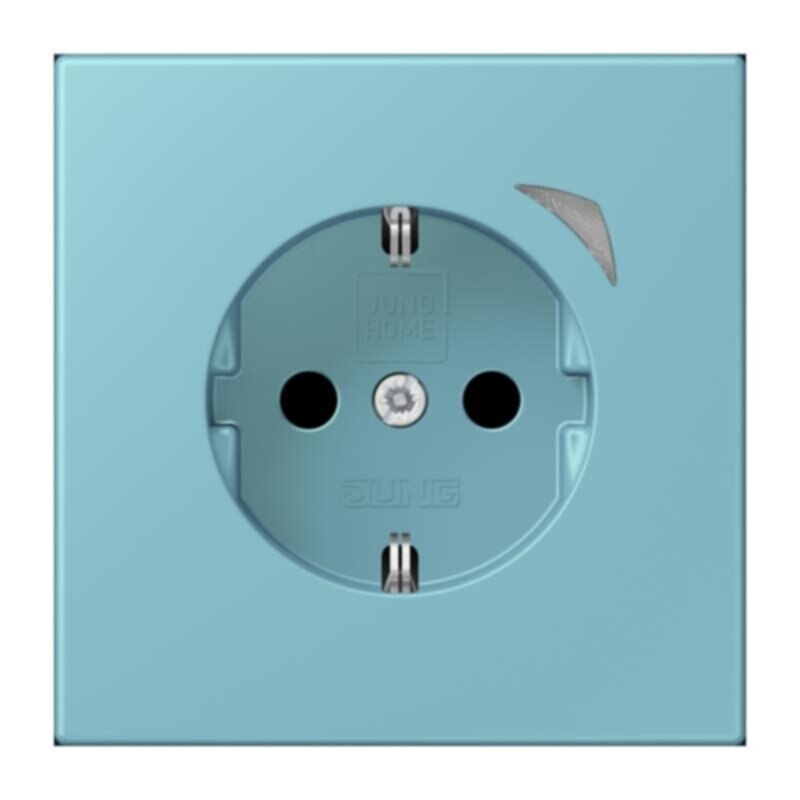 JUNG HOME Schutzkontakt® Steckdose Energy, céruléen moyen mit integriertem erhöhten Berührungsschutz (Safety Plus) mit Schraubklemmen für starre und flexible Leiter bis 2,5 mm2 Verbindungsklemmen nach DIN VDE 0620 Tragring, Krallen und Krallenschrauben sind über eine Erdungsschiene in die Schutzmaßnahme eingebunden. Bestimmungsgemäßer Gebrauch Manuelles oder automatisches Schalten von Beleuchtung und haushaltsüblichen Geräten Leistungs- (W) und Energiemessung (kWh) der angeschlossenen Geräte Drahtlose Verknüpfung mit Geräten des JUNG HOME Systems Einsatz im trockenen Innenbereich Montage in Gerätedose mit Abmessungen nach DIN 49073 Tiefe der Gerätedose (Innenmaß): min. 53 mm   Produkteigenschaften Inbetriebnahme und Bedienung über JUNG HOME App mit mobilem Endgerät (Smartphone oder Tablet) über Bluetooth® Taste zum Schalten Mehrfarbige Statusanzeige mit optionalem Nachtmodus Sperren der lokalen Bedienung Bis zu 16 Zeitprogramme Einbindung der Last in Bereiche (Gruppen), Zentralfunktionen und Szenen Automatikfunktionen aktivieren/deaktivieren über JUNG HOME App Automatische Datum- und Uhrzeitaktualisierung bei Verbindung mit Smartphone Integrierter Schaltaktor mit 16 A Leistungsmessung von 0,1 bis 3680 Watt und Energiemessung (kWh) Aufzeichnung des Energieverlaufes letzte 24 Stunden und letzte 31 Tage (Charting) Betriebsstundenzähler, Zeitraum der Energiemessung Power-Save-Funktion (Abschalten von Standby-Verbrauchern) Master-Slave-Funktion (abhängig vom angeschlossenen Verbraucher einen drahtlos verknüpften Verbraucher einschalten) Überstrom-Schutzabschaltung Bluetooth® SIG Mesh für voll verschlüsselte drahtlose Kommunikation und Repeaterfunktion Updatefähig über JUNG HOME App Zukünftig per Update verfügbar: (Hinweise zu Updates und Terminen finden sie unter jung.group/junghome) Sperr- und Zwangsführung: Dauer-EIN/AUS oder für feste Zeit EIN/AUS Zeitprogramme mit Sonnenauf- bzw. Sonnenuntergang (Astrotimer) Zeitprogramme mit Zufallszeitpunkt Ein-/ Ausschaltverzögerung Eingespeiste Leistung von -0,1 bis -3680 Watt und eingespeiste Energie (kWh) Material: Thermoplast lackiert Maße (B x H): 70 x 70 mm