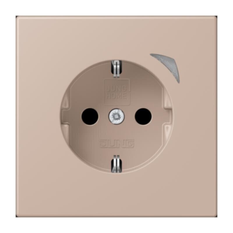 JUNG HOME Schutzkontakt® Steckdose Energy, ombre brûlée claire mit integriertem erhöhten Berührungsschutz (Safety Plus) mit Schraubklemmen für starre und flexible Leiter bis 2,5 mm2 Verbindungsklemmen nach DIN VDE 0620 Tragring, Krallen und Krallenschrauben sind über eine Erdungsschiene in die Schutzmaßnahme eingebunden. Bestimmungsgemäßer Gebrauch Manuelles oder automatisches Schalten von Beleuchtung und haushaltsüblichen Geräten Leistungs- (W) und Energiemessung (kWh) der angeschlossenen Geräte Drahtlose Verknüpfung mit Geräten des JUNG HOME Systems Einsatz im trockenen Innenbereich Montage in Gerätedose mit Abmessungen nach DIN 49073 Tiefe der Gerätedose (Innenmaß): min. 53 mm   Produkteigenschaften Inbetriebnahme und Bedienung über JUNG HOME App mit mobilem Endgerät (Smartphone oder Tablet) über Bluetooth® Taste zum Schalten Mehrfarbige Statusanzeige mit optionalem Nachtmodus Sperren der lokalen Bedienung Bis zu 16 Zeitprogramme Einbindung der Last in Bereiche (Gruppen), Zentralfunktionen und Szenen Automatikfunktionen aktivieren/deaktivieren über JUNG HOME App Automatische Datum- und Uhrzeitaktualisierung bei Verbindung mit Smartphone Integrierter Schaltaktor mit 16 A Leistungsmessung von 0,1 bis 3680 Watt und Energiemessung (kWh) Aufzeichnung des Energieverlaufes letzte 24 Stunden und letzte 31 Tage (Charting) Betriebsstundenzähler, Zeitraum der Energiemessung Power-Save-Funktion (Abschalten von Standby-Verbrauchern) Master-Slave-Funktion (abhängig vom angeschlossenen Verbraucher einen drahtlos verknüpften Verbraucher einschalten) Überstrom-Schutzabschaltung Bluetooth® SIG Mesh für voll verschlüsselte drahtlose Kommunikation und Repeaterfunktion Updatefähig über JUNG HOME App Zukünftig per Update verfügbar: (Hinweise zu Updates und Terminen finden sie unter jung.group/junghome) Sperr- und Zwangsführung: Dauer-EIN/AUS oder für feste Zeit EIN/AUS Zeitprogramme mit Sonnenauf- bzw. Sonnenuntergang (Astrotimer) Zeitprogramme mit Zufallszeitpunkt Ein-/ Ausschaltverzögerung Eingespeiste Leistung von -0,1 bis -3680 Watt und eingespeiste Energie (kWh) Material: Thermoplast lackiert Maße (B x H): 70 x 70 mm