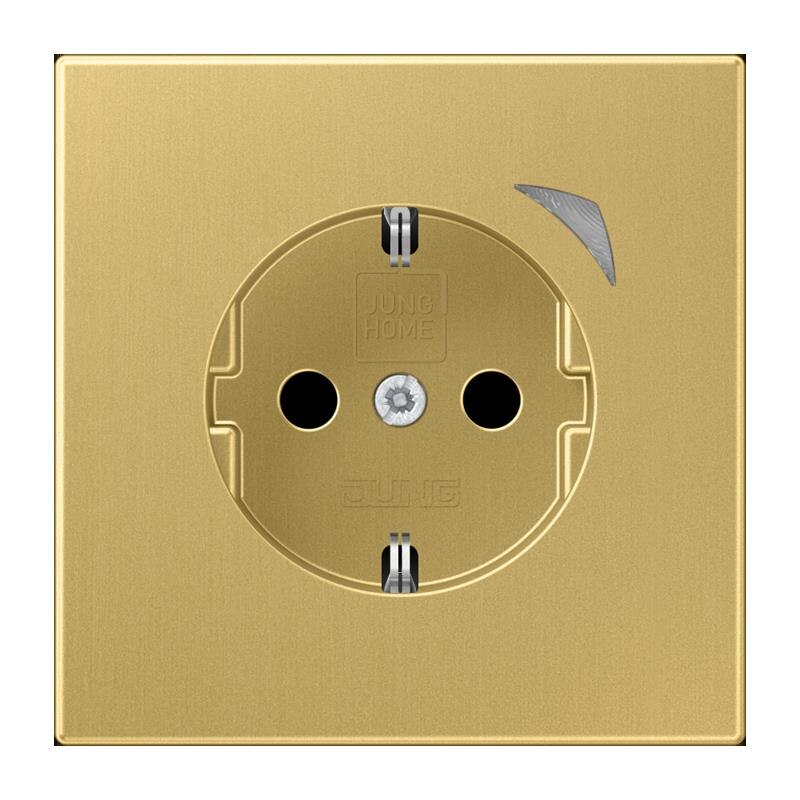 JUNG HOME Schutzkontakt® Steckdose Energy, Messing classic mit integriertem erhöhten Berührungsschutz (Safety Plus) mit Schraubklemmen für starre und flexible Leiter bis 2,5 mm2 Verbindungsklemmen nach DIN VDE 0620 Tragring, Krallen und Krallenschrauben sind über eine Erdungsschiene in die Schutzmaßnahme eingebunden. Bestimmungsgemäßer Gebrauch Manuelles oder automatisches Schalten von Beleuchtung und haushaltsüblichen Geräten Leistungs- (W) und Energiemessung (kWh) der angeschlossenen Geräte Drahtlose Verknüpfung mit Geräten des JUNG HOME Systems Einsatz im trockenen Innenbereich Montage in Gerätedose mit Abmessungen nach DIN 49073 Tiefe der Gerätedose (Innenmaß): min. 53 mm   Produkteigenschaften Inbetriebnahme und Bedienung über JUNG HOME App mit mobilem Endgerät (Smartphone oder Tablet) über Bluetooth® Taste zum Schalten Mehrfarbige Statusanzeige mit optionalem Nachtmodus Sperren der lokalen Bedienung Bis zu 16 Zeitprogramme Einbindung der Last in Bereiche (Gruppen), Zentralfunktionen und Szenen Automatikfunktionen aktivieren/deaktivieren über JUNG HOME App Automatische Datum- und Uhrzeitaktualisierung bei Verbindung mit Smartphone Integrierter Schaltaktor mit 16 A Leistungsmessung von 0,1 bis 3680 Watt und Energiemessung (kWh) Aufzeichnung des Energieverlaufes letzte 24 Stunden und letzte 31 Tage (Charting) Betriebsstundenzähler, Zeitraum der Energiemessung Power-Save-Funktion (Abschalten von Standby-Verbrauchern) Master-Slave-Funktion (abhängig vom angeschlossenen Verbraucher einen drahtlos verknüpften Verbraucher einschalten) Überstrom-Schutzabschaltung Bluetooth® SIG Mesh für voll verschlüsselte drahtlose Kommunikation und Repeaterfunktion Updatefähig über JUNG HOME App Zukünftig per Update verfügbar: (Hinweise zu Updates und Terminen finden sie unter jung.group/junghome) Sperr- und Zwangsführung: Dauer-EIN/AUS oder für feste Zeit EIN/AUS Zeitprogramme mit Sonnenauf- bzw. Sonnenuntergang (Astrotimer) Zeitprogramme mit Zufallszeitpunkt Ein-/ Ausschaltverzögerung Eingespeiste Leistung von -0,1 bis -3680 Watt und eingespeiste Energie (kWh) Material: Thermoplast lackiert Maße (B x H): 70 x 70 mm