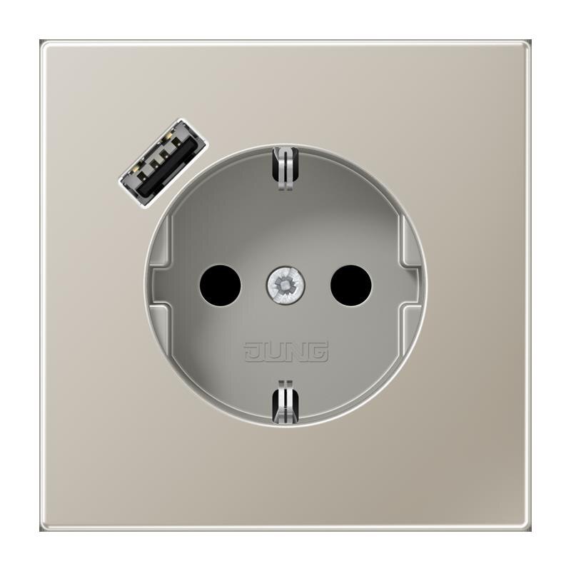 mit integriertem erhöhten Berührungsschutz (Safety Plus) mit 1 USB-Buchse Typ A mit Schnellladefunktion mit Federklemmen für starre und unbehandelte flexible Leiter bis 2,5 mm2 Verbindungsklemmen nach DIN VDE 0620 Montage in Gerätedose mit Abmessungen nach DIN 49073 Tiefe der Gerätedose (Innenmaß): min. 57 mm Material: Edelstahl 1.4303 X4 CrNi 18-12