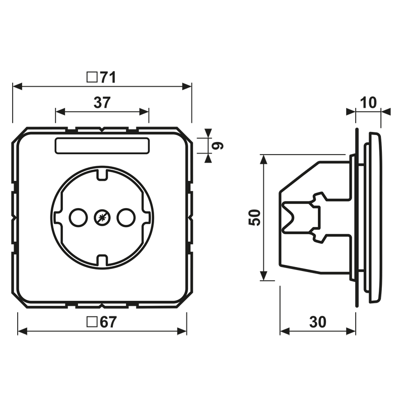 Schutzkontakt®-Steckdose, weiß mit Schriftfeld 6 x 37 mm mit Federklemmen für starre und unbehandelte flexible Leiter bis 2,5 mm2 Verbindungsklemmen nach DIN VDE 0620 Tragring, Krallen und Krallenschrauben sind über eine Erdungsschiene in die Schutzmaßnahme eingebunden. Ersatzteil: Transparente Abdeckung mit Einlage Art.-Nr.: CD 20 NA Material: Duroplast Maße (B x H): 67 x 67 mm