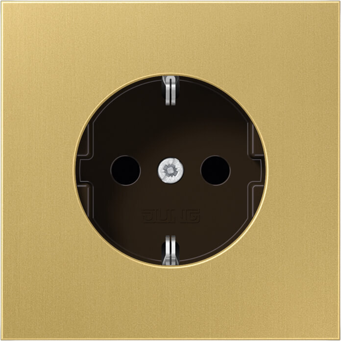 Schutzkontakt® Steckdose, Messing classic mit Federklemmen für starre und unbehandelte flexible Leiter bis 2,5 mm2 Verbindungsklemmen nach DIN VDE 0620 (Schraubbefestigung, ohne Befestigungskrallen) Tragring ist über eine Erdungsschiene in die Schutzmaßnahme eingebunden. Material: Messing Maße (B x H): 70 x 70 mm