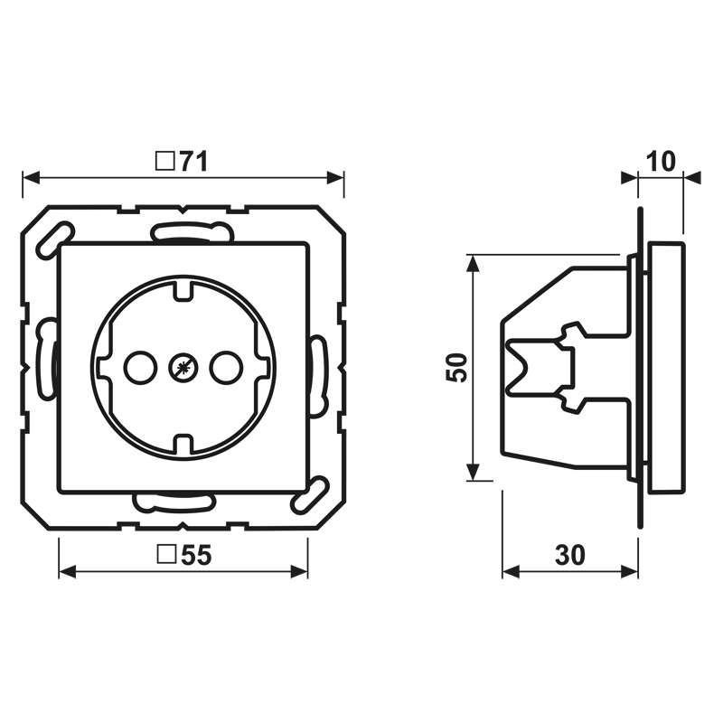 Schutzkontakt® Steckdose, weiß mit integriertem erhöhten Berührungsschutz (Safety Plus) mit Federklemmen für starre und unbehandelte flexible Leiter bis 2,5 mm2 Verbindungsklemmen nach DIN VDE 0620 Tragring, Krallen und Krallenschrauben sind über eine Erdungsschiene in die Schutzmaßnahme eingebunden. Material: Duroplast Maße (B x H): 55 x 55 mm