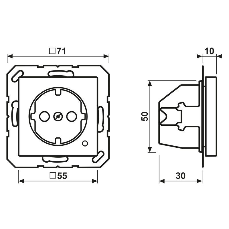Schutzkontakt®-Steckdose, alpinweiß mit Funktionsanzeige (grüne LED) Art.-Nr.: 193-LED GN (nach DIN VDE 0100 Teil 710.55.3) mit integriertem erhöhten Berührungsschutz (Safety Plus) mit Federklemmen für starre und unbehandelte flexible Leiter bis 2,5 mm2 Verbindungsklemmen nach DIN VDE 0620 Tragring, Krallen und Krallenschrauben sind über eine Erdungsschiene in die Schutzmaßnahme eingebunden. Funktionsanzeige ohne Spannungsunterbrechung von vorne austauschbar Material: Duroplast antimikrobiell Maße (B x H): 55 x 55 mm