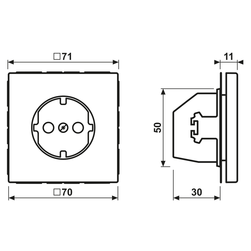 Schutzkontakt®-Steckdose, alpinweiß mit Federklemmen für starre und unbehandelte flexible Leiter bis 2,5 mm2 Verbindungsklemmen nach DIN VDE 0620 (Schraubbefestigung, ohne Befestigungskrallen) Tragring ist über eine Erdungsschiene in die Schutzmaßnahme eingebunden. Material: Duroplast antimikrobiell Maße (B x H): 70 x 70 mm