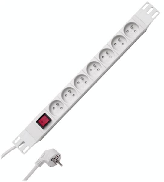 PROFIversal 7-fach, mit 2-poligem beleuchteten Schalter, mit 45. gedrehten Töpfen, 44,45mm Topfabstand, universelle Befestigungsmöglichkeit, wiederanschliesbar, Zuleitung H05VV-F3G 1,5mm2, 2m, mit Schutzkontakt-Winkelstecker, 250VAC, 16A, Länge 482,6mm, UTE, CEE7.V, Farbe: aluminium