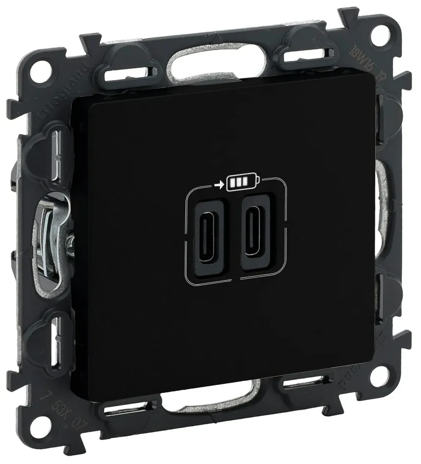2-fach USB-Ladesteckdosen Typ C, USB-C-Stecker, lassen sich beidseitig einstecken, z. B. zum Laden von Smartphones, MP3-/MP4-Player und Tablets. Ausgangsspannung 5 V mit maximalem Ladestrom von 3000 mA bei einem Gerät oder 1500 mA pro Ausgang bei gleichzeitigem Laden von 2 Geräten, Schraubklemmenanschluss: 230 V~, 15W, Verbrauch im Standbymodus 0,075W, geliefert inkl. Abdeckung, Ladekabel nicht im Lieferumfang enthalten. Farbe: Schwarz