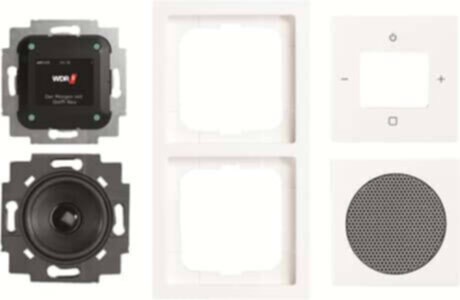 Einbaufertiger DAB+-Radiowecker für Monobetrieb (Set-Verpackung). Mit hochauflösendem Farbdisplay zur Anzeige von Zusatzinformationen. Mit Bluetooth Schnittstelle zur Musikwiedergabe von mobilen Geräten. Anschluss externer Bluetooth Lautsprecher möglich. Bestehend aus Busch-Radio BTconnect DAB+ 8217 U-101. Bestehend aus Lautsprecher-Einsatz 8223 U. Bestehend aus Zentralscheibe für Busch-Radio 8252-84-101. Bestehend aus Zentralscheibe für Lautsprecher-Einsatz 8253-84. Bestehend aus 2-fach future linear Abdeckrahmen 1722-184K. Keine Spreize. Schraubbefestigung über Schlüssellöcher. : future linear, Plattform 63