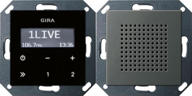 Unterputz-Radio RDS mit einem Lautsprecher Bedienaufsatz in Schwarzglasoptik Edelstahl Merkmale: UKW-Radio mit RDS-Anzeige zur Unterputz-Montage. Das Unterputz-Radio RDS besteht aus einem Einsatz Radio mit Bedienaufsatz und einem Einsatz Lautsprecher mit Abdeckung. Der Einsatz Radio ist kompakt in einem Unterputz-Einsatz untergebracht und kann somit in eine einzelne Gerätedose installiert werden. Der Lautsprecher kann mit dem Einsatz Radio in einer Kombination oder auch abgesetzt in eine Gerätedose installiert werden. An den Einsatz Radio können zwei Lautsprecher angeschlossen werden. Das Radio erkennt angeschlossene Lautsprecher automatisch und schaltet zwischen Stereo- und Monobetrieb um. Das Display des Bedienaufsatzes zeigt bei einem entsprechenden RDS-Signal den Sendernamen, die Sendefrequenz und die Uhrzeit an. Die Bedienung des Radios erfolgt über die kapazitiven Tasten des Bedienaufsatzes. Zur Bedienung ist lediglich eine leichte Berührung der Symbole notwendig. Das Unterputz-Radio RDS verfügt über zwei Speicherplätze, auf denen je ein Sender einfach per Tastenbetätigung gespeichert und abgerufen werden kann. Über den Nebenstelleneingang kann das Radio z. B. mit einem Lichtschalter oder einem Automatikschalter zusammen mit der Raumbeleuchtung eingeschaltet werden. Über den Stereo-AUX-Eingang des Radios können externe Audioquellen, z. B. MP3-Player, in das Radio eingespeist werden. Zum Anschluss der externen Audioquelle wird zusätzlich ein Einsatz Cinch Audio benötigt, welcher an die AUX-Klemmen des Einsatzes Radio angeschlossen wird. Der Einsatz Dockingstation wird zur Musikwiedergabe direkt an den Stereo-AUX-Eingang angeschlossen. Im Sleep-Modus schaltet das Radio 30 Minuten nach dem Einschalten automatisch wieder aus. Hinweise : In Kombination mit weiteren elektronischen Geräten unter einer gemeinsamen Abdeckung kann es zu Empfangsbeeinträchtigungen kommen.