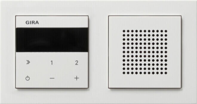 Unterputz-Radio IP Reinweiß glänzend Unterputz-Radio IP mit einem Lautsprecher, komplett mit Abdeckrahmen Gira E2 - Internetradio zur Unterputz-Montage. - Mit dem Radio können über WLAN Internetradiosender abgespielt werden. - Alternativ kann das Radio zum Bedienen von Sonos Lautsprechern genutzt werden. - Auch das Einspielen von Musikdateien via Bluetooth von einem mobilen Endgerät ist möglich. - Die Bedienung des Radios erfolgt über die kapazitiven Tasten des Bedienaufsatzes. Zur Bedienung ist lediglich eine leichte Berührung der Symbole notwendig. - Die Einbindung in das WLAN kann in einfachster Form über die WPS-Funktion erfolgen. - Darüber hinaus kann die Inbetriebnahme komfortabel mit der Gira System 3000 App über ein mobiles Endgerät vorgenommen werden. Mit der App können auch alle weiteren Einstellungen des Radios erfolgen. Es können bis zu 20 Favoritensender hinterlegt werden, die ersten drei Sender können direkt mit den Favoritentasten am Radio aufgerufen werden. - Weitere Funktionen über die App sind die Auswahl der Betriebsarten Internet-Radio oder Sonos-Bedienung , die individuelle Anordnung der Displayinhalte, Klangeinstellung, Wetterprognose und Weckfunktion. - Über den 230-V-Nebenstelleneingang kann das Radio z. B. mit einem Lichtschalter oder einem Bewegungsmelder zusammen mit der Raumbeleuchtung eingeschaltet werden. - Das Radio ist kompakt in einem Unterputz-Einsatz untergebracht und kann somit in eine einzelne Gerätedose installiert werden. - Der Lautsprecher kann mit dem Radio in einer Kombination oder auch abgesetzt in eine Gerätedose installiert werden. An den Einsatz Radio können zwei Lautsprecher angeschlossen werden. Das Radio kann im Mono- und Stereobetrieb arbeiten. - Im Sleep-Modus schaltet das Radio 30 Minuten nach dem Einschalten automatisch wieder aus. Auch als Wecker kann das Radio genutzt werden. In Kombination mit weiteren elektronischen Geräten unter einer gemeinsamen Abdeckung kann es zu Empfangsbeeinträchtigungen kommen.