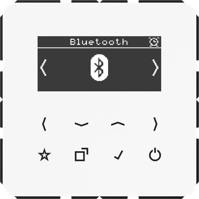 zur Montage in Einfach- oder Mehrfachrahmen und Aufputz-Kappen inklusive Netzteil Bestimmungsgemäßer Gebrauch DAB-Empfang im Frequenzbereich 174 MHz bis 240 MHz (VHF-Band III und Kanal 13) UKW-Empfang im Frequenzbereich 87,5 MHz bis 108 MHz (VHF-Band II) Wiedergabe und Steuerung der Musik von mobilen Geräten über Bluetooth® Montage auf Gerätedose mit Abmessungen nach DIN 49073 Tiefe der Gerätedose (Innenmaß): min. 40 mm Produkteigenschaften Digitalradio mit Display und Sensortasten Echtglasfront Stereoempfang Anschlussklemmen für zwei Lautsprecher Stereo-/Monoumschaltung Einfache Bedienung Integrierte Antenne für DAB+ und UKW Hohe Empfangsqualität Automatischer Sendersuchlauf Speicherung von 8 Favoriten DAB+ und 8 Favoriten UKW (bleiben nach Spannungsausfall erhalten) Speicherung von 8 Bluetooth®-Audioquellen Bluetooth®-Gerätename änderbar Einschalten mit letztem Sender Einschalten mit letzter Lautstärke Einschalten mit letzter Betriebsart (DAB+, UKW oder Bluetooth )® Anzeige von Senderinformationen, Uhrzeit und aktuellen Einstellungen Aktualisierung der Uhrzeit über RDS und DAB+ Display-Helligkeit einstellbar Nachtmodus Weckfunktion Sleep-Modus Ein-/Ausschalten über Nebenstelle Line-Out-Ausgang (AUX) zum Anschluss an externe Verstärker Optionale externe Wurfantenne Art.-Nr.: RAD-ANT Nebenstellenfunktion Über den Nebenstelleneingang kann das Radio gemeinsam mit der Beleuchtung geschaltet werden.