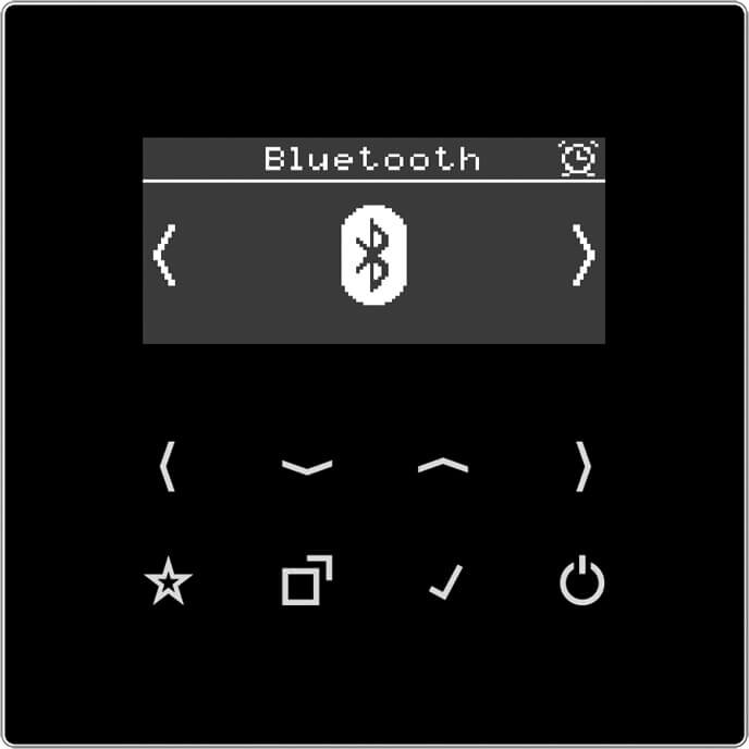 zur Montage in Einfach- oder Mehrfachrahmen und Aufputz-Kappen inklusive Netzteil Bestimmungsgemäßer Gebrauch DAB-Empfang im Frequenzbereich 174 MHz bis 240 MHz (VHF-Band III und Kanal 13) UKW-Empfang im Frequenzbereich 87,5 MHz bis 108 MHz (VHF-Band II) Wiedergabe und Steuerung der Musik von mobilen Geräten über Bluetooth® Montage auf Gerätedose mit Abmessungen nach DIN 49073 Tiefe der Gerätedose (Innenmaß): min. 40 mm Produkteigenschaften Digitalradio mit Display und Sensortasten Echtglasfront Stereoempfang Anschlussklemmen für zwei Lautsprecher Stereo-/Monoumschaltung Einfache Bedienung Integrierte Antenne für DAB+ und UKW Hohe Empfangsqualität Automatischer Sendersuchlauf Speicherung von 8 Favoriten DAB+ und 8 Favoriten UKW (bleiben nach Spannungsausfall erhalten) Speicherung von 8 Bluetooth®-Audioquellen Bluetooth®-Gerätename änderbar Einschalten mit letztem Sender Einschalten mit letzter Lautstärke Einschalten mit letzter Betriebsart (DAB+, UKW oder Bluetooth )® Anzeige von Senderinformationen, Uhrzeit und aktuellen Einstellungen Aktualisierung der Uhrzeit über RDS und DAB+ Display-Helligkeit einstellbar Nachtmodus Weckfunktion Sleep-Modus Ein-/Ausschalten über Nebenstelle Line-Out-Ausgang (AUX) zum Anschluss an externe Verstärker Optionale externe Wurfantenne Art.-Nr.: RAD-ANT   Nebenstellenfunktion Über den Nebenstelleneingang kann das Radio gemeinsam mit der Beleuchtung geschaltet werden.