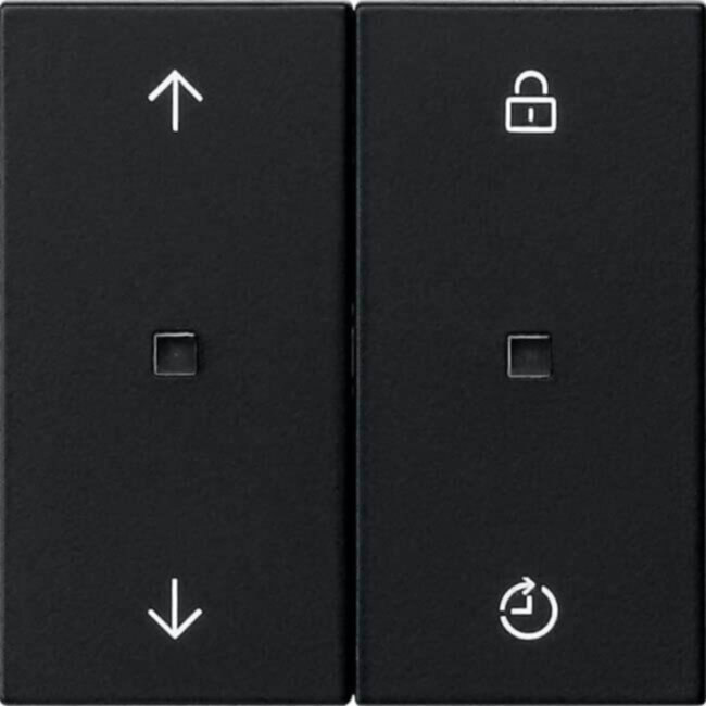 System 3000 Bedienaufsatz Memory Pfeilsymbole Schwarz matt (lackiert) - Speichern einer Herauf- und Herunterfahrzeit bzw. einer Ein- und Ausschaltzeit. Im Memorybetrieb werden diese Schaltzeiten im 24-Stunden-Rhythmus wiederholt.r - Sperrfunktion sperrt die Nebenstellenbedienung und deaktiviert den Memorybetrieb.r - Nachtmodus einstellbar. Status- und Funktions-LED leuchten nicht dauerhaft.