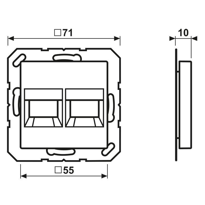 (kpl. mit Tragring, Schraubbefestigung) Verschlussklappe mit Rückstellfeder Innenmaß Keystone-Halterung 15,3 x 19,3 mm für Universalmodul Art.-Nr.: UMA-CAT6A-25 für 2 Steckbuchsen auch für Modular-Jack-Steckbuchsen der Firma RADIALL Modular Jack ungeschirmt Cat. 4, 6-pol. RJ 12 (Art.-Nr. R280MOD804) Cat. 4, 8-pol. RJ 45 (Art.-Nr. R280MOD805) Cat. 5e, 8-pol. RJ 45 (Art.-Nr. R280MOD807) der Firma Panduit Keystone Jack Cat. 3 RJ 45 (KJ 88..) Cat. 5 RJ 45 (KJ 588..) der Firma Assmann Modul DN-93612 Cat. 6A, geschirmt, Keystone Modul DN-93614 der Firma SCHRACK HSPMRJ6G1A, HSEMRJ6GBA, HSEMRJ6GBS, HSEMRJ6GWA, HSEMRJ6GWS, HSEMRJ6UWS