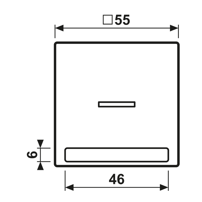 Wippe, graphitschwarz matt für Kontrollschalter Art.-Nrn.: 506 KOU, 502 KOU, 503 KOU, 506-20 KOU, 502-20 KOU für Tast-Kontrollschalter Art.-Nrn.: 506 KOTU, 502 KOTU für beleuchtbare Taster Art.-Nrn.: 531 U, 533 U, 533-2 U, 534 U Material: Thermoplast lackiert Maße (B x H): 55 x 55 mm