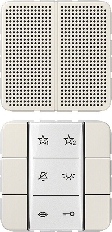 für die Serie CD inklusive Tastensatz und Beschriftungsfolie ohne Rahmen Die Module der Innenstation sind kombinierbar mit Mehrfachrahmen (waagerecht oder senkrecht). Eine abgesetzte Montage in separaten Rahmen sowie eine Montage in Aufputz-Kappen ist möglich. Produkteigenschaften Rufen, Sprechen, Türöffnen, Licht, Etagenruf, Schalt-/Steuerfunktionen und interne Kommunikation Verpolungssichere 2-Draht-Installation (J-Y(St)Y 2 x 2 x 0,8) Sprechentaste mit grüner Status-LED Licht-, Rufabschalt- und die beiden Funktionstasten frei konfigurierbar. Funktion der Tasten ohne Zusatzinstallation auslösbar, z.B. für Interntelefonie, Auslösung von Schalt-/Steuerfunktionen in Verbindung mit Siedle Bus-Schaltmodul BSM/BSE 650-.., gezielte Anwahl von Türlautsprechern (Außenstationen) Auf die Türöffnertaste kann eine Schaltfunktion (in Verbindung mit Siedle Bus-Schaltmodul BSM/BSE 650-..) per BPS konfiguriert werden. Mithörsperre integriert Parallelschaltung (gleichzeitiges Rufen) von max. 4 Audiomodulen bzw. Audio-Innenstationen (Ab dem 3. Gerät ist die Siedle BPS zur Programmierung erforderlich) Sprechverbindung jederzeit, auch ohne erfolgten Türruf, möglich Hochwertiger Klang und große Lautsprecherdynamik Elektret-Kondensatormikrofon Anschluss für Siedle In-Home-Bus Anschluss für Etagenruftaster Rufgenerator mit 11 Ruftonmelodien, inkl. Gong Ruftonlautstärke in 5 Stufen einstellbar bis zu 92 dB(A) Sprachlautstärke in 5 Stufen einstellbar Programmierung Manuell, Plug+Play und über Siedle Bus-Programmier-Software (BPS), nach Siedle Systemhandbuch Innenstation mit Freisprechen Statusanzeige bei aktiver Sprechverbindung Rufabschaltung mit Statusanzeige Rufunterscheidung für Etagenruf, 2 Türrufe und Internruf Türöffner-/Lichtfunktion jederzeit über Busleitung Türrufübernahme Gruppenbildung für Türrufe. Jede Innenstation kann bis zu 4 Gruppen am selben Strang angehören Intercom-Funktionen:- Rufweiterleitung- Interner Gruppenruf- Automatische Gesprächsannahme bei Internruf- Türmatik 5 LEDs zur Anzeige (z.B. Tür offen) ohne zusätzliche Verdrahtung Anzeige der Betriebsbereitschaft über eine LED Optische Rufanzeige durch Blinken der LED an der Sprechentaste Beschriftungsfeld Inklusive Beschriftungsfolien mit Symbolen für Audio und Video Inklusive Anschlusskabel Audio (rot, 220 mm)