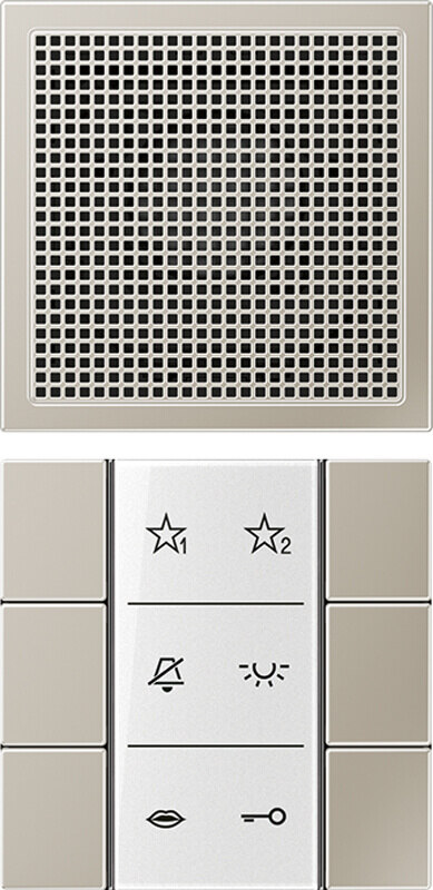 für die Serie LS inklusive Tastensatz und Beschriftungsfolie ohne Rahmen Die Module der Innenstation sind kombinierbar mit Mehrfachrahmen (waagerecht oder senkrecht). Eine abgesetzte Montage in separaten Rahmen sowie eine Montage in Aufputz-Kappen ist möglich. Produkteigenschaften Rufen, Sprechen, Türöffnen, Licht, Etagenruf, Schalt-/Steuerfunktionen und interne Kommunikation Verpolungssichere 2-Draht-Installation (J-Y(St)Y 2 x 2 x 0,8) Sprechentaste mit grüner Status-LED Licht-, Rufabschalt- und die beiden Funktionstasten frei konfigurierbar. Funktion der Tasten ohne Zusatzinstallation auslösbar, z.B. für Interntelefonie, Auslösung von Schalt-/Steuerfunktionen in Verbindung mit Siedle Bus-Schaltmodul BSM/BSE 650-.., gezielte Anwahl von Türlautsprechern (Außenstationen) Auf die Türöffnertaste kann eine Schaltfunktion (in Verbindung mit Siedle Bus-Schaltmodul BSM/BSE 650-..) per BPS konfiguriert werden. Mithörsperre integriert Parallelschaltung (gleichzeitiges Rufen) von max. 4 Audiomodulen bzw. Audio-Innenstationen (Ab dem 3. Gerät ist die Siedle BPS zur Programmierung erforderlich) Sprechverbindung jederzeit, auch ohne erfolgten Türruf, möglich Hochwertiger Klang und große Lautsprecherdynamik Elektret-Kondensatormikrofon Anschluss für Siedle In-Home-Bus Anschluss für Etagenruftaster Rufgenerator mit 11 Ruftonmelodien, inkl. Gong Ruftonlautstärke in 5 Stufen einstellbar bis zu 92 dB(A) Sprachlautstärke in 5 Stufen einstellbar Programmierung Manuell, Plug+Play und über Siedle Bus-Programmier-Software (BPS), nach Siedle Systemhandbuch Innenstation mit Freisprechen Statusanzeige bei aktiver Sprechverbindung Rufabschaltung mit Statusanzeige Rufunterscheidung für Etagenruf, 2 Türrufe und Internruf Türöffner-/Lichtfunktion jederzeit über Busleitung Türrufübernahme Gruppenbildung für Türrufe. Jede Innenstation kann bis zu 4 Gruppen am selben Strang angehören Intercom-Funktionen:- Rufweiterleitung- Interner Gruppenruf- Automatische Gesprächsannahme bei Internruf- Türmatik 5 LEDs zur Anzeige (z.B. Tür offen) ohne zusätzliche Verdrahtung Anzeige der Betriebsbereitschaft über eine LED Optische Rufanzeige durch Blinken der LED an der Sprechentaste Beschriftungsfeld Inklusive Beschriftungsfolien mit Symbolen für Audio und Video Inklusive Anschlusskabel Audio (rot, 220 mm)