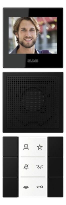 2-polige Zusatzversorgung notwendig (J-Y(St)Y 2 x 2 x 0,8) Automatische Videoaufschaltung bei Türruf Sprechentaste mit grüner Status-LED Licht-, Rufabschalt-, Monitor- und Funktionstaste frei konfigurierbar. Funktion der Tasten ohne Zusatzinstallation auslösbar, z.B. für Interntelefonie, Auslösung von Schalt-/Steuerfunktionen in Verbindung mit Siedle Bus-Schaltmodul BSM/BSE 650-.., gezielte Anwahl von Türlautsprechern (Außenstationen)/Kameras Auf die Türöffnertaste kann eine Schaltfunktion (in Verbindung mit Siedle Bus-Schaltmodul BSM/BSE 650-..) per BPS konfiguriert werden. Mithör- und Mitsehsperre integriert Parallelschaltung (gleichzeitiges Rufen) von max. 16 Video-Innenstationen (Ab dem 3. Gerät ist die Siedle BPS zur Programmierung erforderlich.) Sprech-/Videoverbindung jederzeit, auch ohne erfolgten Türruf, möglich Hochwertiger Klang und große Lautsprecherdynamik Elektret-Kondensatormikrofon Anschluss für Siedle In-Home-Bus Anschluss für Etagenruftaster Rufgenerator mit 11 Ruftonmelodien, inkl. Gong Ruftonlautstärke in 5 Stufen einstellbar bis zu 92 dB(A) Sprachlautstärke in 5 Stufen einstellbar Programmierung Manuell, Plug+Play und über Siedle Bus-Programmier-Software (BPS), nach Siedle Systemhandbuch Innenstation mit Freisprechen Statusanzeige bei aktiver Sprechverbindung Rufabschaltung mit Statusanzeige Rufunterscheidung für Etagenruf, 2 Türrufe und Internruf Türöffner-/Lichtfunktion jederzeit über Busleitung Türrufübernahme Gruppenbildung für Türrufe. Jede Innenstation kann bis zu 4 Gruppen am selben Strang angehören Intercom-Funktionen:- Rufweiterleitung- Interner Gruppenruf- Sammeldurchsage- Automatische Gesprächsannahme bei Internruf- Türmatik 5 LEDs zur Anzeige (z.B. Tür offen) ohne zusätzliche Verdrahtung Anzeige der Betriebsbereitschaft über eine LED Optische Rufanzeige durch Blinken der LED an der Sprechentaste Beleuchtbares Beschriftungsfeld Inklusive Beschriftungsfolien mit Symbolen für Audio und Video Inklusive Anschlusskabel Audio (rot, 220 mm) Anschluss für Zusatzversorgung (Wird benötigt für den Betrieb eines Videomoduls, die Beleuchtung des Beschriftungsfelds im Tastmodul Universal und bei Anschluss eines zweiten Tastmoduls.) Anschluss für ein weiteres Tastmodul (Standard oder Universal, max. 2 Tastmodule pro Innenstation)