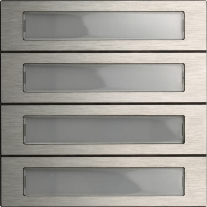 System 106 Ruftastenmodul 4fach Edelstahl V4A Das Gira System 106 ist ein Installationssystem aus Echtmetall in puristisch-edlem Design ohne Rahmen, basierend auf einem Grundmaß von 106,5 × 106,5 mm und einer geringen Aufbauhöhe von 28,7 mm. Mit der modularen Türstation im Gira System 106 beginnt Gastlichkeit schon vor der Haustür. Von Ruftasten-, Sprach- und Kameramodul bis hin zum Info- und Blindmodul präsentieren sich alle Funktionen in einem stimmigen Gesamtbild. Im Dunkeln sorgen die hinterleuchteten Ruftasten mit Beschriftungsfeld für gute Lesbarkeit und eine ansprechende Erscheinung. Individuell anpassbar durch modularen Aufbau Das System 106 kann in Ein-und Mehrfamilienhäusern, aber auch in Bürogebäuden, Industrieobjekten und Hotels eingesetzt werden. Der modulare Aufbau ermöglicht es, das System in Größe, Design und Funktionalität individuell an den jeweiligen Bedarf anzupassen. Erweiterungen und Änderungen sind durch Modulaustausch jederzeit einfach möglich. Selbst ein reiner Frontwechsel ist mit dem System möglich. Somit kann das Erscheinungsbild der Anlage auch nachträglich von z. B. Verkehrsweiß auf die Oberfläche Edelstahl geändert werden, ohne dabei die Elektronikeinheiten mit tauschen zu müssen. Hochwertige Materialien Die Module sind rahmenlos mit Echtmaterial-Designfronten in zwei gebürsteten Edelstahlvarianten (V2A und V4A), eloxiertem Aluminium C-0 und einer verkehrsweiß (RAL 9016) lackierten Metalllegierung erhältlich: robuste Materialien, die für Langlebigkeit sorgen. Kamera- und Anzeigemodul (DIN 18040) verfügen über eine Schwarzglasabdeckung. Die Edelstahloberfläche V4A ( xxxxx 914) ist für die Verwendung in Seewassernähe geeignet und zusätzlich harmoniert sie besonders gut mit der Oberfläche des Briefkastenherstellers Renz Einfache Installation und stufenweise Montage Bei der Montageart Aufputz kann das System parallel zum Baufortschritt in verschiedenen Stufen installiert werden. So ist es möglich, beim Rohbau zunächst nur den unteren Teil des Aufputz-Gehäuses zu montieren, Leitungen und Module können dann hinzugefügt werden, wenn sie gebraucht werden. Individuelle Beschriftungsmöglichkeiten Ruftasten- und Info-Module können über den Gira Beschriftungsservice individuell laserbeschriftet werden. Merkmale: Angenehm zu bedienende, vandalismussichere und zudem kratzfeste Ruftaster. Funktionsänderungen, z. B. von 2fach auf 4fach, lassen sich einfach durch Ersetzen der Tasten realisieren. Verschiedenen Beschriftungsvarianten möglich. Hinweise : Professionelle Beschriftung über den Gira Beschriftungsservice www.beschriftung.gira.de.