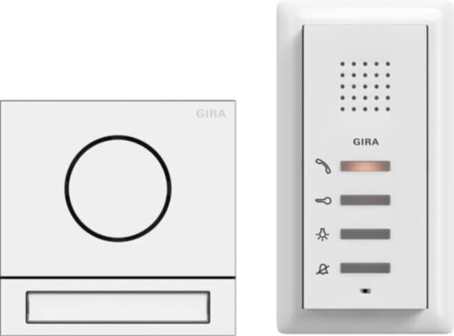 System 106 Einfamilienhaus-Paket Audio Ausführung in Edelstahlvariante V2A oder Verkehrsweiß (lackiert). 1 x Steuergerät Audio, {b}1287 00{\b}. 1 x System 106 Türstationsmodul, {b}5565 ..{\b}. 1 x Freischaltcode zur Anforderung einer beschrifteten Ruftaste {b}5549 ..{\b}. 1 x System 106 Aufputz-Gehäuse 1fach, {b}5501 ..{\b}. 1 x Wohnungsstation AP, System 55 Reinweiß glänzend, {b}1250 03{\b}. 1 x Abdeckrahmen 2fach ohne Mittelsteg, System 55, Reinweiß glänzend, {b}1002 03{\b}.