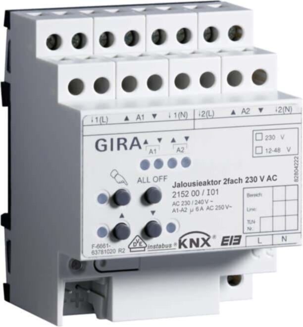 KNX Jalousieaktor 2fach AC 230 V mit Handbetätigung REG plus Jalousieaktoren mit integrierter Busankopplung, Handbetätigung und Statusanzeige für jeden Ausgang. Zum Ansteuern von elektrisch betriebenen Jalousien, Rollläden, Markisen, Lüftungsklappen oder ähnlichen Behängen. Merkmale: Behangposition direkt ansteuerbar. Lamellenstellung direkt ansteuerbar. Verhalten bei Busspannungsausfall und -wiederkehr einstellbar. Separat parametrierbare Fahrzeiten mit Fahrzeitverlängerung für Fahrten in die obere Endlage. Zentrale Ansteuerung aller Jalousieausgänge möglich. Rückmeldung der Behangposition oder der Lamellenposition. Rückmeldungen lassen sich nach Busspannungswiederkehr verzögern. Zuordnungen auf bis zu fünf verschiedene Sicherheitsfunktionen (drei Windalarme, ein Regenalarm, ein Frostalarm), wahlweise mit zyklischer Überwachung. Zwangsstellungsfunktion für jeden Jalousieausgang realisierbar. Einbeziehung in Szenen möglich, max. acht interne Szenen je Kanal sind parametrierbar. Speicherfunktion für Lichtszenen. Sonnenschutzfunktion mit festen und variablen Behang- oder Lamellenpositionen aktivierbar. Erweiterter Sonnenschutz mit umfangreichen Steuerfunktionen. Einbindung in Temperatur-Management des Gebäudes möglich. Sperren einzelner Ausgänge per Hand oder Bus. Aktive oder passive (Objekt auslesbar) zyklische Rückmeldefunktionen. Baustellenbetrieb: Ausgänge manuell bedienbar ohne Busspannung nur mit der Betriebsspannung. Für Netzspannung AC 230 V. Anschluss verschiedener Außenleiter. Unabhängige Ansteuerung der zwei Jalousieausgänge. Automatische Behang Fahrzeiterkennung bei AC 230 V Antrieben mit mechanischen Endlagenschaltern. Hinweise : Montage auf DIN-Hutschiene.