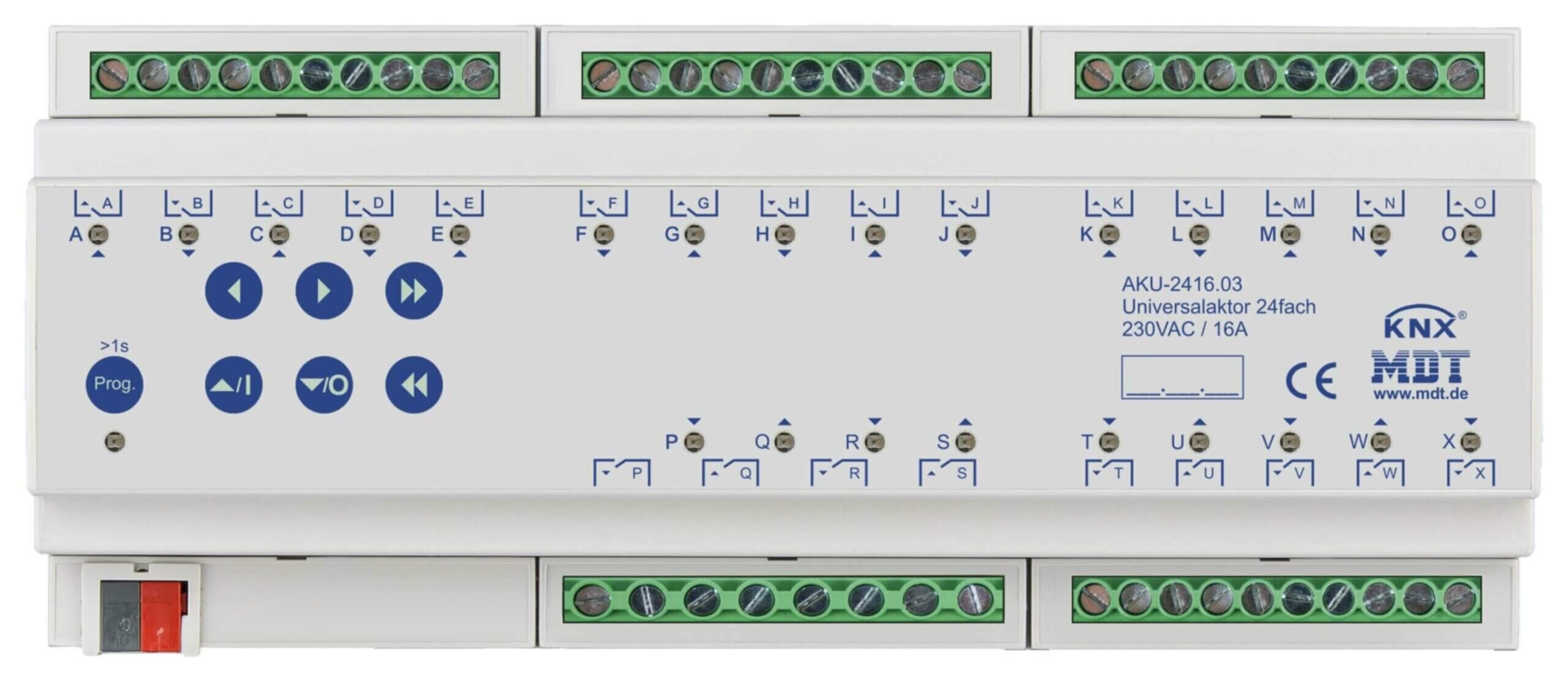 Der MDT Technologies Universalaktor AKU 24-fach empfängt KNX / EIB-Telegramme und kann je nach Parametrierung flexibel als Schaltaktor oder Jalousieaktor eingesetzt werden. Weiterhin sind beliebige Mischformen aus Schalt- und Jalousieaktor möglich. Jeder Ausgang wird über ein bistabiles Relais geschaltet und kann zusätzlich über die Taster am Aktor manuell betätigt werden.