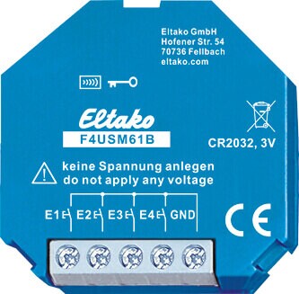 Funk-4-fach-Universal-Sendemodul. Mit innenliegender Antenne. Mit Batterie (Lebensdauer 5-8 Jahre). Für Einbaumontage. 45mm lang, 45mm breit, 18mm tief. Dieses Funk-Sendemodul hat vier Kanäle und kann damit wie ein 4-Kanal-Funktaster Funktelegramme in den Eltako-Gebäudefunk senden. E1 veranlasst ein Funktelegramm wie Wippe oben drücken eines Funktasters mit einer Wippe, E2 wie Wippe unten drücken (bzw. jeweils rechte Wippe eines Funktasters mit Doppelwippe), E3 wie linke Wippe oben drücken eines Funktasters mit einer Doppelwippe und E4 wie linke Wippe unten drücken eines Funktasters mit einer Doppelwippe. Das Telegramm beim Öffnen der Steuerkontakte ist identisch wie Funktaster loslassen. Die Steuereingänge können mit innenliegenden Jumpern entweder für Taster (Auslieferzustand), Fenster-Türkontakte oder Bewegungsmelder aktiviert werden. Mit einer Leitungslänge von bis zu 10 Metern können auch konventionelle Taster, Fenster-Türkontakte oder potenzialfreie Bewegungsmelder-Kontakte an die Klemmen E1, E2, E3 und E4 angeschlossen werden. Der Gegenpol ist jeweils die Klemme GND. Die Elektronik wird von einer innenliegenden Knopfzelle CR2032 versorgt. Zur Aktivierung der Batterieversorgung durch Herausziehen eines Isolierstreifens und zum Wechseln der Batterie muss das Gehäuse geöffnet werden. Dies ist auch zur Wahl der Modi erforderlich. Zum Öffnen des Gehäuses mit einem Schraubendreher den Deckel an den Laschen entriegeln und abnehmen.
