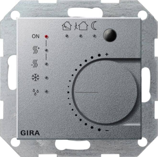 KNX Stetigregler mit Tasterschnittstelle 4fach System 55 Farbe Alu Die Stetigregler Unterputz und die Objektregler vereinen die Funktionen eines KNX Busankopplers, eines Raumtemperaturreglers mit Sollwertvorgabe und die eines Binäreingangs. Merkmale: An den Binäreingang können vier potenzialfreie Kontakte angeschlossen werden. Der Eingang 1 kann zum Anschluss eines Fernfühlers für die Temperaturmessung im Fußboden benutzt werden. Zwei Eingänge sind als Ausgänge (max. 0,8 mA) parametrierbar. Die Reglerfunktion dient zur Raumtemperaturregelung. Der Regler erfasst mit einem internen bzw. externen Temperaturfühler die aktuelle Raumtemperatur und verarbeitet diese mit einem einstellbaren Temperatursollwert zu einer Stellgröße. Es können damit Stellantriebe mit stetigem Stellsignal als auch mit schaltendem Stellsignal angesteuert werden. Regler: 5 Betriebsarten: Komfort, Stand-by, Nacht, Frost- bzw. Hitzeschutz und Reglersperre (z. B. Taupunkt-Betrieb). Heiz- Kühlfunktionen: Heizen, Kühlen, Heizen und Kühlen, Grund- und Zusatzheizen, Grund- und Zusatzkühlen. Voreingestellte Regelparameter für gängige Heiz- bzw. Kühlkörper. Regler abschaltbar (Taupunktbetrieb) bzw. Regler oder Bedienung des Reglers sperrbar. Ventilschutzfunktion (Ventil wird zyklisch alle 24 Stunden geöffnet). Regelungsarten: Stetige PI-Regelung, schaltende PI-Regelung (PWM) und schaltende 2-Punkt-Regelung (Ein Aus). Temperaturerfassung über einen internen und oder externen Fühler (Mittelwertbildung für große Räume). Eingänge: Freie Zuordnung der Funktionen Schalten, Dimmen, Jalousie und Wertgeber zu den Eingängen. Sperrobjekt zum Sperren einzelner Eingänge. Verhalten bei Busspannungswiederkehr für jeden Eingang separat parametrierbar. Telegrammratenbegrenzung. Funktion Schalten: zwei unabhängige Schaltobjekte für jeden Eingang vorhanden und einzeln freischaltbar, Befehl bei steigender und fallender Flanke unabhängig einstellbar (EIN, AUS, UM, keine Reaktion). Funktion Dimmen: Einflächen- und Zweiflächenbedienung, Zeit zwischen Dimmen und Schalten und Dimmschrittweite einstellbar, Telegramm-Wiederholung und Stopp-Telegramm senden möglich. Funktion Jalousie: Befehl bei steigender Flanke einstellbar (keine Funktion, AUF, AB, UM), Bedienkonzept parametrierbar (Step – Move – Step bzw. Move – Step), Zeit zwischen Kurz- und Langzeitbetrieb einstellbar, Lamellenverstellzeit einstellbar. Funktion Wertgeber und Lichtszenennebenstelle: Flanke (Taster als Schließer, Taster als Öffner, Schalter) und Wert bei Flanke parametrierbar, Wertverstellung bei Taster über langen Tastendruck für Wertgeber möglich, Lichtszenennebenstelle mit bzw. ohne Speicherfunktion. Funktion Temperaturfühler: Ein Kanal der Tasterschnittstelle kann als externer Temperaturfühler für den Raumtemperaturregler genutzt werden. Ausgänge: Unabhängiges Schalten der max. zwei Ausgänge. Mit dem Stellrad wird der Temperatursollwert verschoben. Ein Präsenztaster dient zur Umschaltung zwischen Komfort- und Stand-by-Betrieb. Die aktuellen Zustände werden am Stetigregler durch LEDs angezeigt. Hinweise : Es ist kein separater Busankoppler notwendig. Bei Anschluss der externen Eingänge wird die Verwendung einer Schalterklemmdose empfohlen.