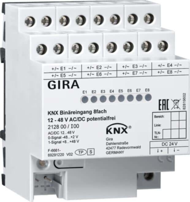 Gira REG Binäreingang 8-fach zum Anschluss von Kontakten: Die Schaltvorgänge von Kontakten (z. B. Wächter bzw. Taster) werden in KNX Telegramme umgesetzt. Die Eingänge können dabei unabhängig voneinander verschiedenen Funktionen zugeordnet oder gesperrt werden. Signalanzeige über gelbe Status-LED möglich.