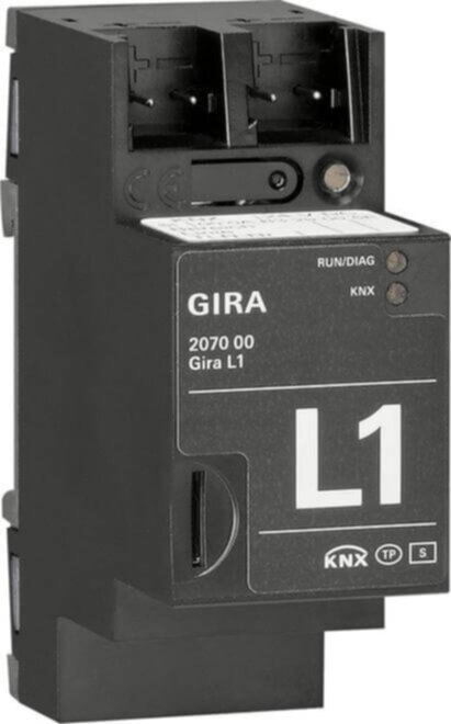 Gira L1 REG Merkmale: Logikfunktionen: Funktionsvielfalt durch Bausteinbibliothek mit 36 Logikbausteinen (z. B. Mathematische Grundfunktionen, sonnenstandsgeführte Rollladen- und Jalousiesteuerung, Temperaturregelung, Trennwandsteuerung, Treppenhauslicht, Zufallsgenerator). Konfigurierbare Logikbausteine (z. B. frei wählbare Anzahl der Eingänge). Einfache Parametrierung von Zeitschaltuhren und Szenen: bis zu 20 Zeitschaltuhren mit jeweils 10 Schaltzeiten. bis zu 20 Szenen-Sets mit jeweils 64 Szenen. Bis zu 480 Datenpunkte in einem Projekt verwendbar (300 KNX Gruppenadressdatenpunkte, 180 frei verfügbare Gerätedatenpunkte). Interkomfunktion um Werte z. B. zwischen einem weiteren L1 oder einem X1 über Ethernet auszutauschen. Optimierte Inbetriebnahme: schnelle Projektänderung oder -aktualisierung im laufenden Betrieb ohne Geräteneustart möglich. Zwei Buchsen RJ45 mit Switch-Funktion unterstützen das einfache Durchschleifen des Patchkabels. Hohe Sicherheit: Die verschlüsselte TLS-Datenübertragung zwischen GPA und Gira L1 verhindert das Mitlesen durch Dritte. Das Geräte-Passwort schützt den Gira L1 vor Fremdzugriff. Projektsicherung: Speichern einer Projektkopie auf dem Gira L1. Inbetriebnahme: Physikalische Adresse und Applikation werden mit der KNX Inbetriebnahme-Software ETS ab der Version 4.1.8 parametriert. Die weitere Projektierung erfolgt über den Gira Projekt Assistenten (GPA). Der Gira Projekt Assistent ist kostenlos im Gira Downloadbereich verfügbar. Funktionale Erweiterungen bzw. Aktualisierungen über Firmware- und Software-Updates. Hardware für KNX Secure vorbereitet. Zukünftiges Firmware-Update erforderlich. Hinweise : Versorgung über externe DC 24 V.