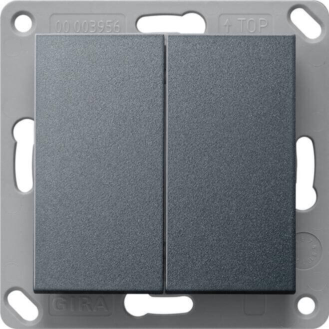 EnOcean Funk Wandsender 2fach Anthrazit System 55 - Funksender zur Übertragung von Schalt-, Dimm- oder Jalousiebefehlen an Funkempfänger des EnOcean-Funksystems. - Batterieloses Gerät ohne externe Spannungsversorgung. Sendeenergie wird aus mechanischer Energie bei Betätigung der Wippe erzeugt. - Verschlüsselte oder unverschlüsselte Funk Übertragung möglich. Montage auf Gerätedose oder auf glatten, ebenen Flächen durch Schrauben oder Kleben. Dieses Produkt ist nicht für eNet verwendbar. Gira EnOcean Sender sind kompatibel mit Aktoren von Drittanbietern. Funk Wandsender, Montageplatte, Klebefolie (Sichtschutz bei Glasflächen) und Klebepunkte für die Montage auf glatten, ebenen Flächen sind im Lieferumfang enthalten.