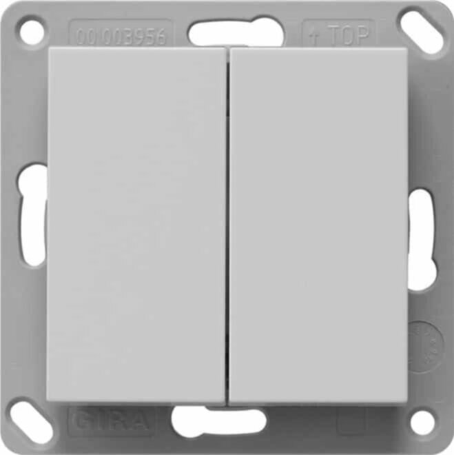 EnOcean Funk Wandsender 2fach Grau matt (lackiert) System 55 - Funksender zur Übertragung von Schalt-, Dimm- oder Jalousiebefehlen an Funkempfänger des EnOcean-Funksystems. - Batterieloses Gerät ohne externe Spannungsversorgung. Sendeenergie wird aus mechanischer Energie bei Betätigung der Wippe erzeugt. - Verschlüsselte oder unverschlüsselte Funk Übertragung möglich. Montage auf Gerätedose oder auf glatten, ebenen Flächen durch Schrauben oder Kleben. Dieses Produkt ist nicht für eNet verwendbar. Gira EnOcean Sender sind kompatibel mit Aktoren von Drittanbietern. Funk Wandsender, Montageplatte, Klebefolie (Sichtschutz bei Glasflächen) und Klebepunkte für die Montage auf glatten, ebenen Flächen sind im Lieferumfang enthalten.