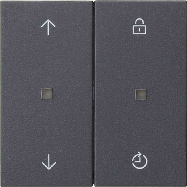 eNet Funk Bedienaufsatz Memory Pfeilsymbole Anthrazit Merkmale: Betrieb auf Schalt-, Dimm- oder Jalousieeinsatz oder Nebenstelleneinsatz 3-Draht des System 3000. Manuelles, funk- und zeitgesteuertes Bedienen von z. B. Jalousien, Rollläden, Markisen, Beleuchtung oder Lüftern. Sender zur Funkübertragung von Schalt-, Dimm- und Jalousiebefehlen. Nachtmodus einstellbar. Status- und Funktions-LED leuchten nicht dauerhaft. Statusrückmeldung an Funksender. Statusanzeige mit LED. Auswertung der Nebenstelleneingänge. Funktionen in Kombination mit Jalousieeinsatz:: Positionierung von Behängen über Szenenaufruf. Position für Sonnenschutz und Dämmerung. Laufzeit und Lüftungsposition des Behanges speicherbar. Funktionen in Kombination mit Lichteinsatz:: Szenenbetrieb möglich. Einschalthelligkeit dauerhaft speicherbar bei Kombination mit Dimmeinsatz. Funktionen in Kombination mit 3-Draht-Nebenstelle:: Spannungsversorgter eNet Sender. Steuerung von Beleuchtung. Steuerung von Beschattung. Mit eNet Server ab Version 2.3 einstellbar (abhängig vom Einsatz):: Vollverschlüsselte Funkübertragung (AES-CCM). Nebenstellenauswertung deaktivieren. Bediensperren. Umsteuerzeit bei Jalousien, Rollläden und Markisen einstellbar. Laufrichtung invertierbar. Position für Sonnenschutz, Dämmerung, Aussperrschutz und Windalarm. Maximalhelligkeit, Minimalhelligkeit und Dimmgeschwindigkeit einstellbar. Funktion der Status-LED einstellbar als Status-LED Betätigungsanzeige. Nachlaufzeit. Ein- bzw. Ausschaltverzögerung. Auf- bzw. Abdimmrampe. Abschaltvorwarnung. Dauer-Ein, Dauer-Aus. Hotelfunktion. Lichtregelung. Repeaterfunktion. Update der Gerätesoftware. Speichern einer Auf- und Abfahrtzeit bzw. einer Ein- und Ausschaltzeit. Im Memorybetrieb werden diese Schaltzeiten im 24-Stunden-Rhythmus wiederholt. Sperrfunktion sperrt die Nebenstellenbedienung, die Bedienung über Funk und deaktiviert den Memorybetrieb. Hinweise : Bei Verwendung eines Aufsatzes aus Metall und oder eines Abdeckrahmen aus Metall kann es zu Reichweiteneinbußen kommen. Die Funkzulassung gilt für Staaten der EU und EFTA.