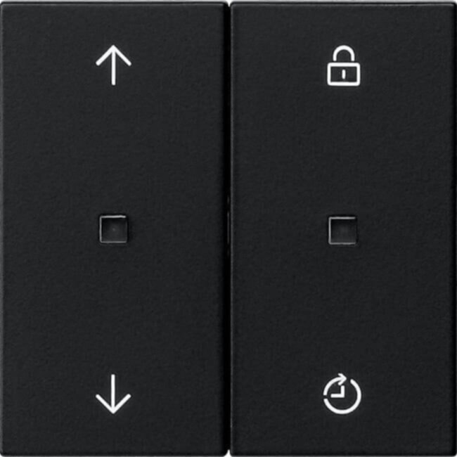 eNet Funk Bedienaufsatz Memory Pfeilsymbole Schwarz matt Merkmale: Betrieb auf Schalt-, Dimm- oder Jalousieeinsatz oder Nebenstelleneinsatz 3-Draht des System 3000. Manuelles, funk- und zeitgesteuertes Bedienen von z. B. Jalousien, Rollläden, Markisen, Beleuchtung oder Lüftern. Sender zur Funkübertragung von Schalt-, Dimm- und Jalousiebefehlen. Nachtmodus einstellbar. Status- und Funktions-LED leuchten nicht dauerhaft. Statusrückmeldung an Funksender. Statusanzeige mit LED. Auswertung der Nebenstelleneingänge. Funktionen in Kombination mit Jalousieeinsatz:: Positionierung von Behängen über Szenenaufruf. Position für Sonnenschutz und Dämmerung. Laufzeit und Lüftungsposition des Behanges speicherbar. Funktionen in Kombination mit Lichteinsatz:: Szenenbetrieb möglich. Einschalthelligkeit dauerhaft speicherbar bei Kombination mit Dimmeinsatz. Funktionen in Kombination mit 3-Draht-Nebenstelle:: Spannungsversorgter eNet Sender. Steuerung von Beleuchtung. Steuerung von Beschattung. Mit eNet Server ab Version 2.3 einstellbar (abhängig vom Einsatz):: Vollverschlüsselte Funkübertragung (AES-CCM). Nebenstellenauswertung deaktivieren. Bediensperren. Umsteuerzeit bei Jalousien, Rollläden und Markisen einstellbar. Laufrichtung invertierbar. Position für Sonnenschutz, Dämmerung, Aussperrschutz und Windalarm. Maximalhelligkeit, Minimalhelligkeit und Dimmgeschwindigkeit einstellbar. Funktion der Status-LED einstellbar als Status-LED Betätigungsanzeige. Nachlaufzeit. Ein- bzw. Ausschaltverzögerung. Auf- bzw. Abdimmrampe. Abschaltvorwarnung. Dauer-Ein, Dauer-Aus. Hotelfunktion. Lichtregelung. Repeaterfunktion. Update der Gerätesoftware. Speichern einer Auf- und Abfahrtzeit bzw. einer Ein- und Ausschaltzeit. Im Memorybetrieb werden diese Schaltzeiten im 24-Stunden-Rhythmus wiederholt. Sperrfunktion sperrt die Nebenstellenbedienung, die Bedienung über Funk und deaktiviert den Memorybetrieb. Hinweise : Bei Verwendung eines Aufsatzes aus Metall und oder eines Abdeckrahmen aus Metall kann es zu Reichweiteneinbußen kommen. Die Funkzulassung gilt für Staaten der EU und EFTA.