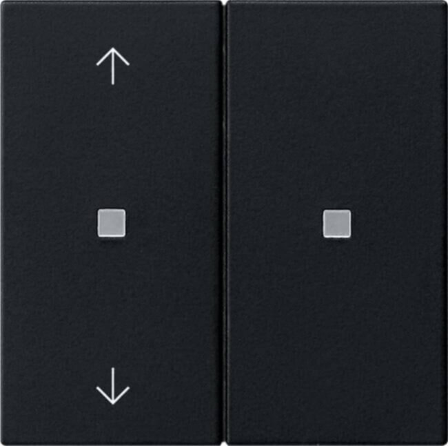 KNX RF Bedienaufsatz 2fach Pfeilsymbole System 55 Schwarz matt KNX RF ¿ das standardisierte Funksystem für die Nachrüstung basierend auf 230 V. Merkmale: KNX RF Bedienaufsatz zur Steuerung von System 3000 Einsätzen sowie entfernten KNX Geräten mittels KNX RF. Wippen- oder Tastenfunktion für jede Bedienfläche einstellbar. Steuerung von bis zu vier Funktionen über die Tastenfunktion des KNX RF Bedienaufsatzes möglich. KNX RF Aktor in Verbindung mit den System 3000 Einsätzen. Betrieb auf Schalt-, Dimm-, Jalousie- oder Raumtemperaturregler-Einsatz sowie Nebenstelleneinsatz 3-Draht des System 3000. Integrierter Temperatursensor. Raumtemperaturmessung: Der RF Bedienaufsatz verfügt über einen geräteinternen Temperatursensor, wodurch das Messen und Weiterleiten der lokalen Raumtemperatur möglich ist. Temperaturmessungen sind nur in Kombination mit den folgenden Einsätzen möglich: Best.-Nr. 5403 00, Best.-Nr. 5405 00, Best.-Nr. 5406 00, Best.-Nr. 5414 00, Best.-Nr. 5415 00, Best.-Nr. 5395 00, Best.-Nr. 5409 00. Bedienfunktionen sind abhängig vom verwendeten Unterputz-Einsatz: Der RF Bedienaufsatz kann mit der System 3000 3-Draht-Nebenstelle als 230-V versorgtes KNX RF Bediengerät betrieben werden. Bedienkonzept Tasten- oder Wippenfunktion ist parametrierbar. Schalten, Dimmen und Farbtemperatur, Farbsteuerung und Helligkeit, Jalousie, Wertgeber, Szenennebenstelle, 2-Kanal Bedienung und Reglernebenstelle. Schalten: Der Befehl beim Drücken und oder Loslassen ist einstellbar (Keine Reaktion, Einschalten, Ausschalten, Umschalten). Dimmen und Farbtemperatur: Helligkeit und oder Farbtemperatur, der Befehl beim Drücken, die Zeit zwischen Schalten und Dimmen, das Dimmen in verschiedenen Stufen, die Telegrammwiederholung bei langer Betätigung und das Senden eines Stopptelegramms bei Ende der Betätigung ist einstellbar. Farbsteuerung und Helligkeit: Farbkreisdurchlauf oder Helligkeitsverstellung, der Befehl beim Drücken, die Zeit zwischen Schalten und Dimmen, der Startwert, die Schrittweite und die Zeit zwischen zwei Telegrammen ist einstellbar. Jalousie: Der Befehl beim Drücken und das Bedienkonzept ist einstellbar. Das Bedienkonzept kann in den Zeiten für kurze und lange Betätigung und Lamellenverstellung angepasst werden. Wertgeber: Die Funktionsweise (1 Byte, 2 Byte, 3 Byte oder 6 Byte Wertgeber) und der Wert ist einstellbar. Szenennebenstelle: Die Funktionsweise (ohne oder mit Speicherfunktion) und die Szenennummer ist einstellbar. 2-Kanal-Bedienung: Durch einen Tastendruck können bis zu zwei Telegramme auf den KNX ausgesendet werden. Das Bedienkonzept kann eingestellt und die Zeit für kurze und lange Betätigung angepasst werden. Die Funktionsweise der Kanäle ist getrennt voneinander einstellbar. Reglernebenstelle: Die Funktionsweise (Betriebsmodusumschaltung, Zwang-Betriebsmodusumschaltung, Präsenzfunktion und Sollwertverschiebung) ist einstellbar. Sperrfunktion zum Sperren von einzelnen Tasten bzw. Wippen. Reglernebenstellen-Eigenschaften: Die Reglernebenstelle ist als Funktion einer Wippe bzw. Taste parametrierbar. Steuerung eines Raumtemperaturreglers (Betriebsmodi, Präsenzfunktion und Sollwertverschiebung). Auswertung des Reglerzustandes uber die Status-LED. Temperaturmessung ist aktivierbar. Messung der Raumtemperatur mit internem Fühler oder optional durch eine Messwertbildung der intern gemessenen Temperatur mit einer externen Temperatur. Funktionen der Status-LED: Die Funktionsauswahl erfolgt je Status-LED. Folgenden Funktionen parametrierbar: immer AUS, immer EIN, Betätigungsanzeige, Telegrammquittierung, Statusanzeige, Ansteuerung über separates LED-Objekt, Betriebsmodusanzeige, Anzeige Reglerstatus, Anzeige Präsenzstatus, Anzeige Sollwertverschiebung. Farbe ist parametrierbar. Die Farbauswahl erfolgt entweder gemeinsam für alle Status-LED oder getrennt für jede Status-LED des Gerätes. Die Status-LED können wahlweise rot, grün oder blau leuchten. Die Helligkeit der Status-LED ist in sechs Stufen einstellbar. Mit der Nachtabsenkung
