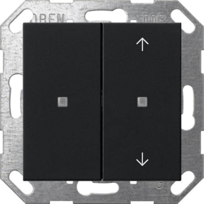 KNX Taster, Wippe 2fach unbedruckt Pfeilsymbole System 55 Schwarz matt Merkmale: KNX Taster mit integriertem Busankoppler. Integrierter Temperatursensor. Wippen- oder Tastenfunktion für jede Bedienfläche einstellbar. Steuerung von bis zu vier Funktionen über die Tastenfunktion des KNX Tasters möglich. Bedienfunktionen: Bedienkonzept Tasten- oder Wippenfunktion ist parametrierbar. Schalten, Dimmen und Farbtemperatur, Farbsteuerung und Helligkeit, Jalousie, Wertgeber, Szenennebenstelle, 2-Kanal-Bedienung und Reglernebenstelle. Schalten: Der Befehl beim Drücken und oder Loslassen ist einstellbar (Keine Reaktion, Einschalten, Ausschalten, Umschalten). Dimmen und Farbtemperatur: Helligkeit und oder Farbtemperatur, der Befehl beim Drücken, die Zeit zwischen Schalten und Dimmen, das Dimmen in verschiedenen Stufen, die Telegrammwiederholung bei langer Betätigung und das Senden eines Stopptelegramms bei Ende der Betätigung ist einstellbar. Farbsteuerung und Helligkeit: Farbkreisdurchlauf oder Helligkeitsverstellung, der Befehl beim Drücken, die Zeit zwischen Schalten und Dimmen, der Startwert, die Schrittweite und die Zeit zwischen zwei Telegrammen ist einstellbar. Jalousie: Der Befehl beim Drücken und das Bedienkonzept ist einstellbar. Das Bedienkonzept kann in den Zeiten für kurze und lange Betätigung und Lamellenverstellung angepasst werden. Wertgeber: Die Funktionsweise (1 Byte, 2 Byte, 3 Byte oder 6 Byte Wertgeber) und der Wert ist einstellbar. Szenennebenstelle: Die Funktionsweise (ohne oder mit Speicherfunktion) und die Szenennummer ist einstellbar. 2-Kanal-Bedienung: Durch einen Tastendruck können bis zu zwei Telegramme auf den KNX ausgesendet werden. Das Bedienkonzept kann eingestellt und die Zeit für kurze und lange Betätigung angepasst werden. Die Funktionsweise der Kanäle ist getrennt voneinander einstellbar. Reglernebenstelle: Die Funktionsweise (Betriebsmodusumschaltung, Zwang-Betriebsmodusumschaltung, Präsenzfunktion und Sollwertverschiebung) ist einstellbar. Sperrfunktion zum Sperren von einzelnen Tasten bzw. Wippen. Reglernebenstellen-Eigenschaften: Die Reglernebenstelle ist als Funktion einer Wippe bzw. Taste parametrierbar. Steuerung eines Raumtemperaturreglers (Betriebsmodi, Präsenzfunktion und Sollwertverschiebung). Auswertung des Reglerzustandes über die Status-LED. Temperaturmessung ist aktivierbar. Messung der Raumtemperatur mit internen Fühler oder optional durch eine Messwertbildung der intern gemessenen Temperatur mit einer externen Temperatur. Funktionen der Status-LED: Die Funktionsauswahl erfolgt je Status-LED. Folgende Funktionen sind parametrierbar: immer AUS, immer EIN, Betätigungsanzeige, Telegrammquittierung, Statusanzeige, Ansteuerung über separates LED-Objekt, Betriebsmodusanzeige, Anzeige Reglerstatus, Anzeige Präsenzstatus und Anzeige Sollwertverschiebung. Farbe ist parametrierbar. Die Farbauswahl erfolgt entweder gemeinsam für alle Status-LED oder getrennt für jede Status-LED des Gerätes. Die Status-LED können wahlweise rot, grün oder blau leuchten. Die Helligkeit der Status-LED ist in fünf Stufen einstellbar. Mit der Nachtabsenkung kann die Helligkeit der Status-LED in den Nachtstunden über Kommunikationsobjekt reduziert werden. Hinweise : KNX Data Secure kompatibel. Firmware-Updates sind mit der Gira ETS Service-App (Zusatzsoftware) möglich. Bei Verwendung von Gira TX_44, Adapterrahmen IP20 und Abdeckung aus dem System 55 verwenden. Die Wippen sind optional gegen alternative Varianten austauschbar.