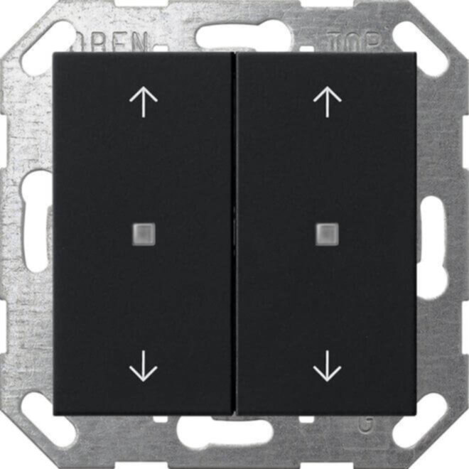 KNX Taster, Wippe 2fach mit Pfeilsymbolen System 55 Schwarz matt Merkmale: KNX Taster mit integriertem Busankoppler. Integrierter Temperatursensor. Wippen- oder Tastenfunktion für jede Bedienfläche einstellbar. Steuerung von bis zu vier Funktionen über die Tastenfunktion des KNX Tasters möglich. Bedienfunktionen: Bedienkonzept Tasten- oder Wippenfunktion ist parametrierbar. Schalten, Dimmen und Farbtemperatur, Farbsteuerung und Helligkeit, Jalousie, Wertgeber, Szenennebenstelle, 2-Kanal-Bedienung und Reglernebenstelle. Schalten: Der Befehl beim Drücken und oder Loslassen ist einstellbar (Keine Reaktion, Einschalten, Ausschalten, Umschalten). Dimmen und Farbtemperatur: Helligkeit und oder Farbtemperatur, der Befehl beim Drücken, die Zeit zwischen Schalten und Dimmen, das Dimmen in verschiedenen Stufen, die Telegrammwiederholung bei langer Betätigung und das Senden eines Stopptelegramms bei Ende der Betätigung ist einstellbar. Farbsteuerung und Helligkeit: Farbkreisdurchlauf oder Helligkeitsverstellung, der Befehl beim Drücken, die Zeit zwischen Schalten und Dimmen, der Startwert, die Schrittweite und die Zeit zwischen zwei Telegrammen ist einstellbar. Jalousie: Der Befehl beim Drücken und das Bedienkonzept ist einstellbar. Das Bedienkonzept kann in den Zeiten für kurze und lange Betätigung und Lamellenverstellung angepasst werden. Wertgeber: Die Funktionsweise (1 Byte, 2 Byte, 3 Byte oder 6 Byte Wertgeber) und der Wert ist einstellbar. Szenennebenstelle: Die Funktionsweise (ohne oder mit Speicherfunktion) und die Szenennummer ist einstellbar. 2-Kanal-Bedienung: Durch einen Tastendruck können bis zu zwei Telegramme auf den KNX ausgesendet werden. Das Bedienkonzept kann eingestellt und die Zeit für kurze und lange Betätigung angepasst werden. Die Funktionsweise der Kanäle ist getrennt voneinander einstellbar. Reglernebenstelle: Die Funktionsweise (Betriebsmodusumschaltung, Zwang-Betriebsmodusumschaltung, Präsenzfunktion und Sollwertverschiebung) ist einstellbar. Sperrfunktion zum Sperren von einzelnen Tasten bzw. Wippen. Reglernebenstellen-Eigenschaften: Die Reglernebenstelle ist als Funktion einer Wippe bzw. Taste parametrierbar. Steuerung eines Raumtemperaturreglers (Betriebsmodi, Präsenzfunktion und Sollwertverschiebung). Auswertung des Reglerzustandes über die Status-LED. Temperaturmessung ist aktivierbar. Messung der Raumtemperatur mit internen Fühler oder optional durch eine Messwertbildung der intern gemessenen Temperatur mit einer externen Temperatur. Funktionen der Status-LED: Die Funktionsauswahl erfolgt je Status-LED. Folgende Funktionen sind parametrierbar: immer AUS, immer EIN, Betätigungsanzeige, Telegrammquittierung, Statusanzeige, Ansteuerung über separates LED-Objekt, Betriebsmodusanzeige, Anzeige Reglerstatus, Anzeige Präsenzstatus und Anzeige Sollwertverschiebung. Farbe ist parametrierbar. Die Farbauswahl erfolgt entweder gemeinsam für alle Status-LED oder getrennt für jede Status-LED des Gerätes. Die Status-LED können wahlweise rot, grün oder blau leuchten. Die Helligkeit der Status-LED ist in fünf Stufen einstellbar. Mit der Nachtabsenkung kann die Helligkeit der Status-LED in den Nachtstunden über Kommunikationsobjekt reduziert werden. Hinweise : KNX Data Secure kompatibel. Firmware-Updates sind mit der Gira ETS Service-App (Zusatzsoftware) möglich. Bei Verwendung von Gira TX_44, Adapterrahmen IP20 und Abdeckung aus dem System 55 verwenden. Die Wippen sind optional gegen alternative Varianten austauschbar.