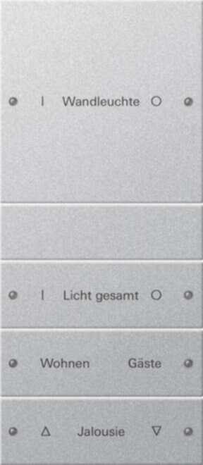 Wippenset 4fach (1 3) beschreibbar System 55 Farbe Alu (lackiert) Hinweise : Beschreibbare Wippensets und Wippensets mit Beschriftungsfeld können mit einer individuellen Beschriftung versehen werden. Die Bestellung wird über den Großhandel abgewickelt, der beim Bestellvorgang der Wippen angegeben wurde. Beschreibbare Wippensets und Wippensets ohne Beschriftungsfeld sind aus Metall. Dies kann bei Funkanwendungen zu Reichweiteneinbußen führen. Dieses Produkt kann ausschließlich über den Gira Beschriftungsservice bestellt werden. Professionelle Beschriftung über den Gira Beschriftungsservice www.beschriftung.gira.de.