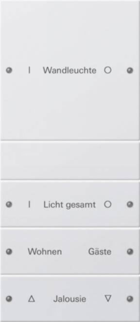 Wippenset 4fach (1 3) beschreibbar System 55 Reinweiß seidenmatt (lackiert) Hinweise : Beschreibbare Wippensets und Wippensets mit Beschriftungsfeld können mit einer individuellen Beschriftung versehen werden. Die Bestellung wird über den Großhandel abgewickelt, der beim Bestellvorgang der Wippen angegeben wurde. Beschreibbare Wippensets und Wippensets ohne Beschriftungsfeld sind aus Metall. Dies kann bei Funkanwendungen zu Reichweiteneinbußen führen. Dieses Produkt kann ausschließlich über den Gira Beschriftungsservice bestellt werden. Professionelle Beschriftung über den Gira Beschriftungsservice www.beschriftung.gira.de.