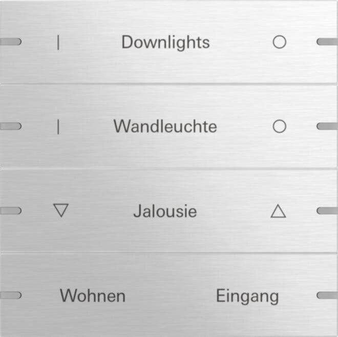 Wippenset 4fach individuell für Tastsensor 4 Aluminium Merkmale: Bedienoberfläche aus hochwertigem drei Millimeter starken Echtmaterial wie Glas, Edelstahl und Aluminium. Die Varianten in den Systemfarben sind lackierte Aluminiumwippen. Die Variante in Bronze ist eine PVD beschichtete Edelstahlwippe. Hinweise : Die Beschriftung erfolgt über den Gira Beschriftungsservice und wird per Lasertechnik präzise und dauerhaft auf das Material aufgebracht. Für eine individuelle Gestaltung stehen Ihnen nach kostenloser Registrierung verschiedene Schriften und Symbole zur Auswahl, so können auch Firmen- oder Hotellogos integriert werden. Die Bestellung wird über den Großhandel abgewickelt, der beim Bestellvorgang der Wippen angegeben wurde. Bitte beachten Sie, dass die Wippensets für den Tastsensor 4 in Glas Weiß aus technischen Gründen nicht per Laser beschriftet werden können. Dieses Produkt kann ausschließlich über den Gira Beschriftungsservice bestellt werden. Professionelle Beschriftung über den Gira Beschriftungsservice www.beschriftung.gira.de.