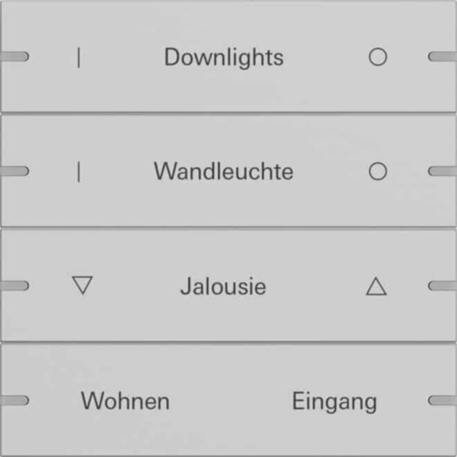 Wippenset 4fach individuell für Tastsensor 4 Grau matt (lackiert) Merkmale: Bedienoberfläche aus hochwertigem drei Millimeter starken Echtmaterial wie Glas, Edelstahl und Aluminium. Die Varianten in den Systemfarben sind lackierte Aluminiumwippen. Die Variante in Bronze ist eine PVD beschichtete Edelstahlwippe. Hinweise : Die Beschriftung erfolgt über den Gira Beschriftungsservice und wird per Lasertechnik präzise und dauerhaft auf das Material aufgebracht. Für eine individuelle Gestaltung stehen Ihnen nach kostenloser Registrierung verschiedene Schriften und Symbole zur Auswahl, so können auch Firmen- oder Hotellogos integriert werden. Die Bestellung wird über den Großhandel abgewickelt, der beim Bestellvorgang der Wippen angegeben wurde. Bitte beachten Sie, dass die Wippensets für den Tastsensor 4 in Glas Weiß aus technischen Gründen nicht per Laser beschriftet werden können. Dieses Produkt kann ausschließlich über den Gira Beschriftungsservice bestellt werden. Professionelle Beschriftung über den Gira Beschriftungsservice www.beschriftung.gira.de.