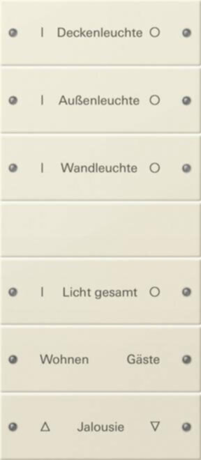 Wippenset 6fach (3 3) beschreibbar System 55 Cremeweiß glänzend (lackiert) Hinweise : Beschreibbare Wippensets und Wippensets mit Beschriftungsfeld können mit einer individuellen Beschriftung versehen werden. Die Bestellung wird über den Großhandel abgewickelt, der beim Bestellvorgang der Wippen angegeben wurde. Beschreibbare Wippensets und Wippensets ohne Beschriftungsfeld sind aus Metall. Dies kann bei Funkanwendungen zu Reichweiteneinbußen führen. Dieses Produkt kann ausschließlich über den Gira Beschriftungsservice bestellt werden. Professionelle Beschriftung über den Gira Beschriftungsservice www.beschriftung.gira.de.